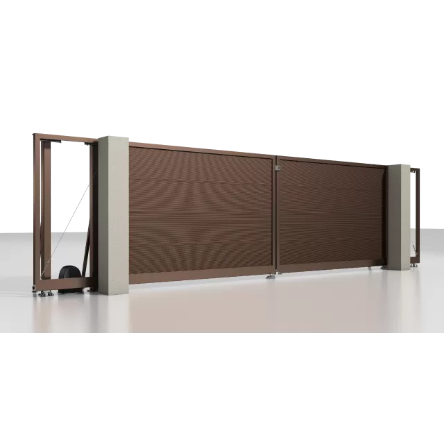 Рама 96 мм. Заполнение: разреженный горизонтальный профиль 82 мм. цвета «Шоколад» (RAL 8017). Привод ALUTECH Scopio